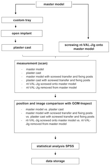 As a result, we were able to conduct three comparisons. Comparison group 1: master model versus stone cast; comparison group 2: master model with screwed transfer and fixing posts versus stone cast with screwed transfer and fixing posts; and comparison group 3: nt-VAL-Jig screwed onto master model versus nt-VAL-Jig removed from master model (Table 2). Ten measurements were performed in each group, one for each master model situation. The same operator performed all the measurements.