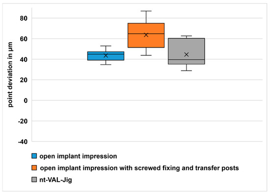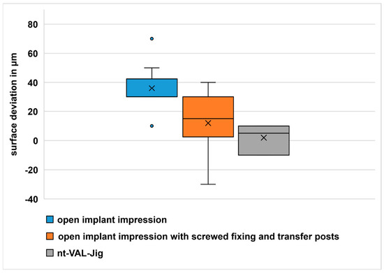 In contrast, the evaluation of the surface distances showed a significant difference in the transfer accuracy between the open-tray implant level impression and the nt-VAL-Jig with a higher accuracy for the latter. These diverging results could be explained with the different calculation procedures. The mean point distance was based on the absolute values of Euclidean distances. Therefore, GOM-Inspect detected the closest neighboring points on the superimposed surfaces and determined the distances from this as the absolute value. In contrast, the surface comparison considered the surface normal, i.e., whether one surface was in front of or behind another. Thus, both positive and negative values could contribute to the calculated mean surface distance and partially cancel each other out. As a result, the two measures provided different information about the deviations in the examined bodies, with the latter being less sensitive in certain cases. Thus, the surface comparison should only be used in addition to the point comparison. Alternatively, the positive and negative deviations had to be calculated separately or as the root mean square. However, this option could not be performed in GOM-Inspect. Moreover, this study was limited due to using the point or surface deviation because the implant position and angulation were not detected on the implant level, so that they could be examined approximately. It would have been possible to reconstruct the position of the implants in group two (master model with screwed transfer and fixing posts versus stone cast with screwed transfer and fixing posts) and group three (nt-VAL-Jig screwed onto master model versus nt-VAL-Jig removed from master model) with a calculation from the scan body position. However, as the implant position was only accessible at the top in the master models and plaster casts, and this would have been insufficient for an exact measurement in our opinion, the measurement was performed the way described. In addition, it had to be limited that the open implant impression was created using 3D-printed individual impression trays, and that this may have limited the impression accuracy. However, this method was chosen in order to obtain a uniform thickness of impression material around the impression copings.