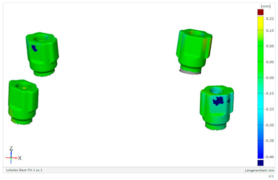 For the comparison between the open-tray implant level impression and the nt-VAL-Jig, the scan data were imported into GOM-Inspect 2019 Hotfix 6 (GOM, Braunschweig, Germany). With this software, the surface of the scan bodies in every situation and group was superimposed with a three-point prealignment, followed by a best fit registration. The detected point and surface deviations were noted. To determine the point deviation, GOM-Inspect evaluated the Euclidean distance between the nearest points on the two aligned scans and calculated the average. The surface deviation was calculated by determining the (signed) distance between the surface elements of the two matched scans.