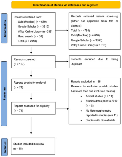 An initial search yielded 4918 articles. A total of 639 articles from Ovid (Medline), 3910 articles from Google Scholar, 338 articles from Wiley Online Library, and 31 articles from hand searching. After screening the article titles and abstracts, a total of 4791 articles were removed as they were not applicable to the research question and/or didn’t satisfy the requirements of the eligibility criteria, which left 127 articles for screening see Figure 1. A further 53 articles were excluded due to being duplicates, which left 74 articles for review. After full-text evaluation and applying the eligibility criteria, 56 articles were excluded, which left a total of 18 articles for inclusion for the study. The excluded studies main reasons included animal studies, studies dated before 2010, studies other than RCTs, no histomorphometry reported, and studies reporting biomaterials other than xenografts which had no natural healing group.