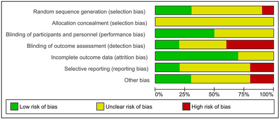 - Higgins, J.P.; Savović, J.; Page, M.J.; Elbers, R.G.; Sterne, J.A. Chapter 8: Assessing Risk of Bias in a Randomised Trial|Cochrane Training. Cochrane Training [Internet]. 2021, pp. 1–50. Available online: https://training.cochrane.org/handbook/current/chapter-08 (accessed on 8 February 2022).