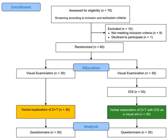 Flow diagram of the investigation (IOS = intraoral scans, D + T = dental findings and treatment plan) according to CONSORT 2010 statement.