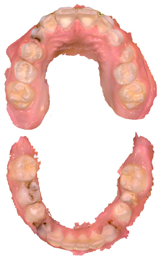 After visual examination by one examiner (N.S.-W.), all children were scanned using a trained examiner (M.G.). Prior to scanning, the IOS Trios 4 (version 20.1.4, 3Shape, Copenhagen, Denmark) was color-calibrated. Scanning was performed, starting with the occlusal surfaces of the jaw, followed by the oral surfaces, and ending with the buccal surfaces.