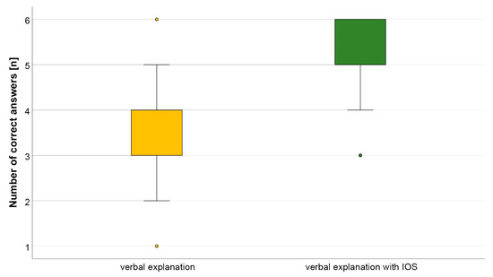 A significant difference between the control group (verbal explanation) and the study group (verbal explanation with IOS) could be detected regarding the number of correct answers in the questionnaire (Figure 4). While 85.5 ± 17.3% (mean ± standard deviation) of the answers were correct in the study group, only 57.2 ± 17.8% of the participants in the control group could answer the questions correctly.