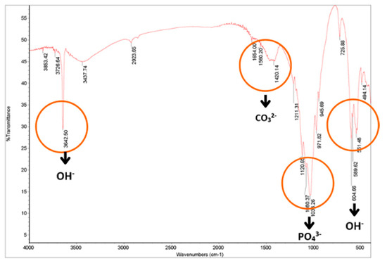 FTIR spectra of specimens tested. The red circles indicate the absorption of waves of blood cockle shell–CHA constituent compounds in the form of OH−, CO32−, and PO43−.