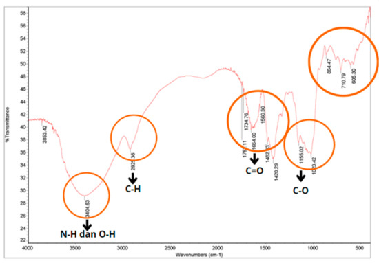 Blood shell chitosan FTIR test results. The red circles indicate the absorption of waves of the compounds that make up chitosan blood cockle shells in the form of N-H, O-H, C-H, C=O, and C-O.