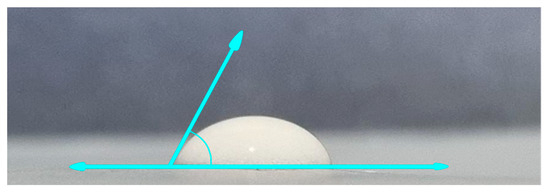 Contact angle test on CHA-CS hydrogel droplets. The blue line indicates the axis of the base surface and the slope of the liquid, forming the angle θ = 72°.