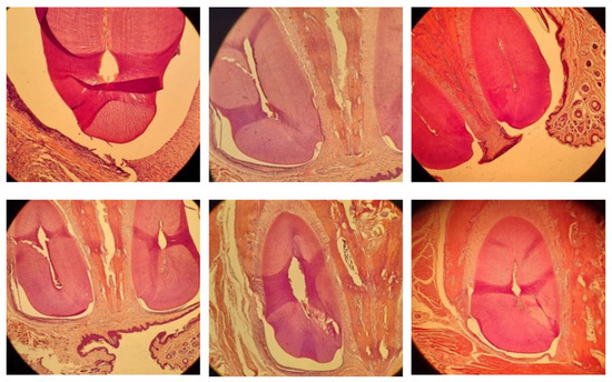 Hematoxylin–eosin staining was utilized for histological observations of osteoblasts, osteoclasts, and fibroblasts. The deparaffination process involved immersing the paraffin blocks in xylol, with each block being treated twice for a duration of 3 min each. The process of rehydration was carried out by employing water in conjunction with a succession of graded alcohols. The samples were subjected to hematoxylin staining for a duration of 6–7 min, followed by washing with running water for 1 min. Subsequently, the samples were subjected to eosin solution staining for a duration of 3 min. Afterward, the samples were rinsed with running water for 1 min, followed by rinsing with 70% alcohol and a final rinse with water for 1 min until the samples were completely clean. Next, the mounting process was carried out using the mounting solution Entellan® and then covered with a cover glass. Ultimately, the desiccated concoction was appropriately marked.