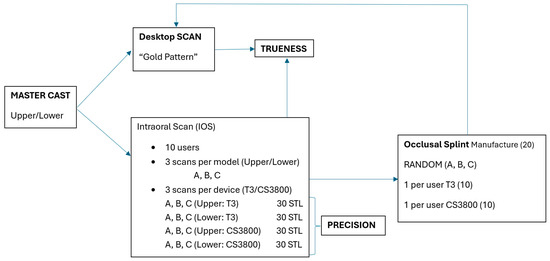 The purpose of this study has been to analyse the behaviour of 3Shape (Copenhagen, Denmark) TRIOS 3, and Carestream CS 3800 (Atlanta, GA, USA) by inexperienced operators in a full arch dentate model that was going to be used for nightguard (intraoral devices) design and manufacturing. The null hypotheses were that no significant difference would be found between 3Shape TRIOS 3 and CS Carestream CS 3800 accuracy (trueness and precision), and that no significant deviation would be added in occlusal splint manufacturing and post-processing.