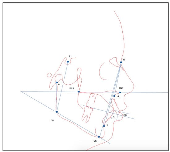 Cephalometric dentofacial characteristics measured on the initial lateral cephalograms of the included patients. Measurements represented in the tracing with blue lines are overjet, overbite, ANB angle, intermaxillary angle (ANS-PNS/Me-Go), gonial angle (Ar-Go-Me), posterior facial height (S-Go), anterior facial height (N-Me). A = A point; ANS = anterior nasal spine; Ar = articulare; B = B point; Go = gonion; Me = menton; N = nasion; OB = overbite; OJ = overjet; PNS = posterior nasal spine; S = sella.