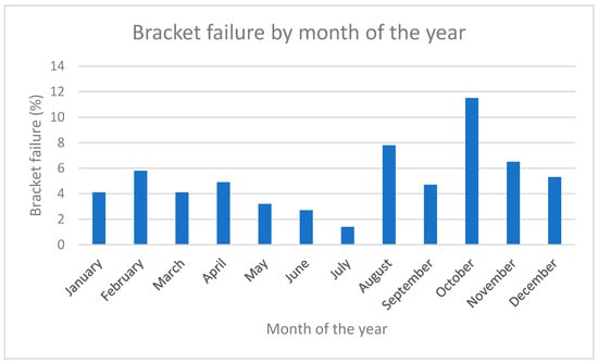 Regarding the total number of bracket failures per patient, 81 patients had no bracket failure during treatment, while 45 had one, 34 had two, 11 had three, 13 had four, and 13 had five or more bracket failures. The average failure rate per patient was 4.8%, and per bracket (when looking at the totality of brackets) was 4.4%, i.e., approximately 1 in 23 brackets failed. When looking at the month of bracket failure, October had the greatest amount of bracket failures (p < 0.001) (Figure 2).