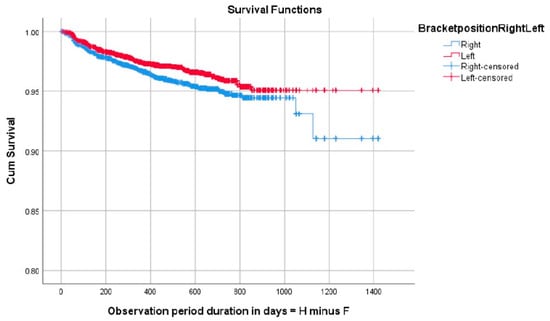 Survival analysis graph showing improved survival in brackets positioned on the left side of the dental arches. Cum Survival = cumulative survival; F = degrees of freedom: H = cumulative hazard rate.