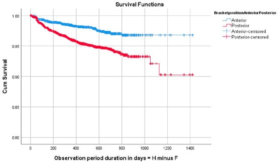 Survival analysis graph showing improved survival in brackets positioned on the anterior segments of the dental arches. Cum Survival = cumulative survival; F = degrees of freedom: H = cumulative hazard rate.
