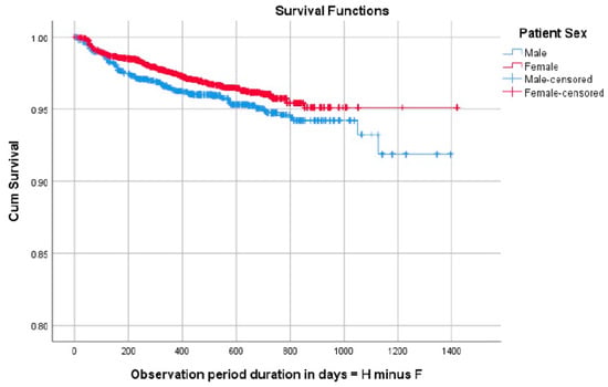 Survival analysis graph showing improved bracket survival in females as compared to males. Cum Survival = cumulative survival; F = degrees of freedom: H = cumulative hazard rate.
