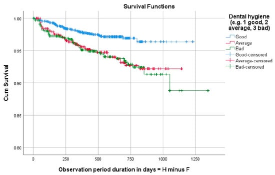 Survival analysis graph showing improved bracket survival in patients with good followed by average followed by poor oral hygiene. Cum Survival = cumulative survival; F = degrees of freedom: H = cumulative hazard rate.