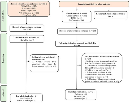 Individual electronic search strategies were conducted on 19 April 2022 and updated on 4 March 2024. The search strategies were done for the following databases: PubMed, Scopus, EMBASE, Web of Science, and LILACS, without period restriction. An additional search in the gray literature including Google Scholar, ProQuest, and “Biblioteca Digital de Teses e Dissertações, Brazil” was performed to identify publications regarding Pan-American notable people with HNC. The search strategy can be found in Table S3. Subsequently, studies retrieved were imported into the Endnote Web (Endnote Web, Clarivate Analytics, Philadelphia, PA, USA) for reference management, where duplicate references were systematically removed. Additionally, the reference lists of all included studies were manually screened to identify further relevant studies.