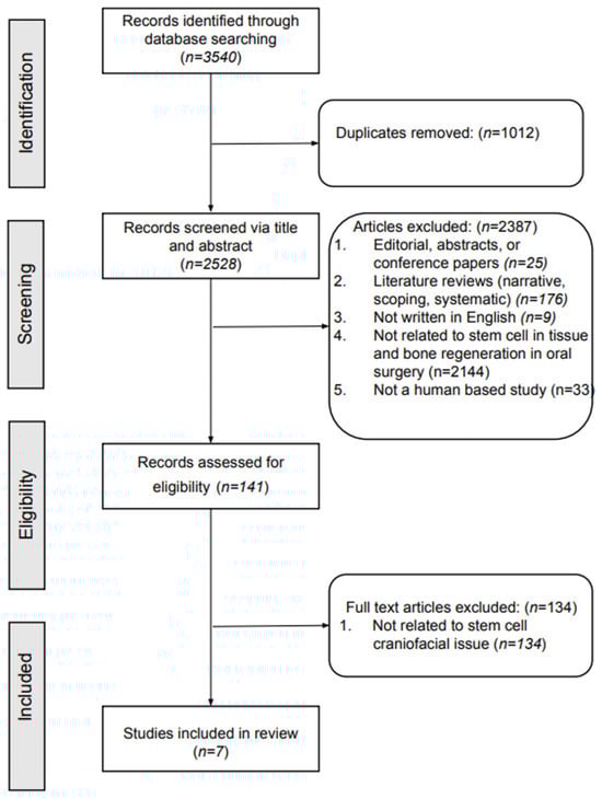 This initial search identified 3540 articles. After removing duplicate articles, 2528 unique articles were reviewed. During screening, 2387 articles were excluded. Further refinement by applying the eligibility criteria led to the exclusion of 141 more articles that lacked relevance to stem cells and maxillofacial issues. Ultimately, 7 articles were selected for inclusion in the systematic review (Figure 1).
