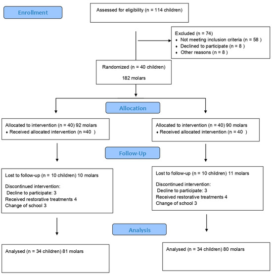 During the 12-month follow-up period, the students were given guidance on their brushing technique and advised to brush their teeth after meals. The specialist clinicians asked the participants about the presence or signs of pain and referred those cases that required other oral treatments to the University Dental Clinic. The molars that were eliminated because they were filled or exfoliated, in addition to those cases when the participant did not remain at the school, are shown in Figure 1.