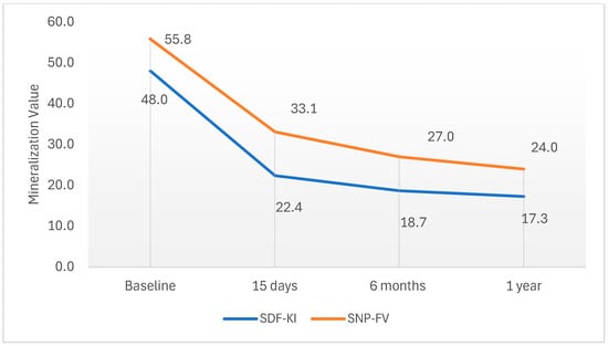 Favorable changes were observed in the demineralization values between the different treatments. Figure 2 shows that there were significant decreases in the demineralization values in the experimental and standard treatment groups (p < 0.05). In the SDF-KI group, the differences with the baseline values were 25.63 at 15 days (p < 0.05), 29.37 at six months (p < 0.05), and 30.6 at one year (p < 0.05). Meanwhile, in the SNP-FV group, the decreases were 22.7 at 15 days (p < 0.05), 28.78 at six months (p < 0.05), and 31.2 at one year (p < 0.05). Table 2 shows the p-values between the SNP-FV and the standard treatment in the different evaluation periods.
