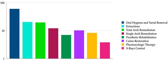 Finally, the complexity of the cases treated is evidenced by the fact that many patients require more than one visit to complete the necessary treatments. This underlines the importance of a preventive as well as interventional approach to be able to intercept the most common oral pathologies in the homeless population from the outset, providing simpler and more timely treatment solutions [45].