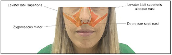 Functionally, the facial muscles, particularly the levator labii superioris and ala nasalis (LLSAN) muscle, play a crucial role. The hyperactivity of these muscles can lead to excessive upper lip elevation, revealing a significant amount of gingiva. The dynamics of these muscles profoundly impact the aesthetics of the smile [7,8]. Previous work has underscored the importance of considering a therapeutic approach that addresses the static and dynamic aspects of the gingival smile [7,8,9,10], addressing the condition’s underlying causes to improve both the function and aesthetic appearance. The cause of a gummy smile may stem from a short lip, a hypermobile lip, or both [11]. Therefore, it becomes imperative to determine the muscles involved in the smile (Figure 1).