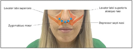 - Pessa, J.E. Improving the Acute Nasolabial Angle and Medial Nasolabial Fold by Levator Alae Muscle Resection. Ann. Plast. Surg. 1992, 29, 23. [Google Scholar] [CrossRef]