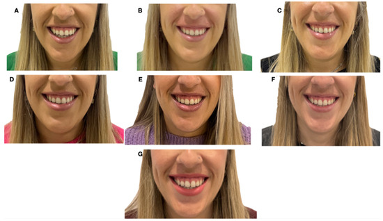 For each patient, measurements (mm) were taken from the lower edge of the upper lip to the incisal edge of 6 teeth: 13, 12, 11, 21, 22, and 23. The study focused on the evolution of the measurements over six time points or milestones, being before treatment (T0), immediately after treatment (T1), and five subsequent revisions: one week after treatment (T2), after one month (T3), and 3 months (T4), 6 months (T5), and 12 months (T6) after treatment.