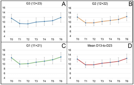 Evolution of the means (and SD) of the GS measurements for groups’ G3 canines (A), G2 lateral incisors (B), G1 central incisors, (C) and the mean of the six tooth measurements, Mean D13 to D23 (D), in successive visits. Milestones or time points are defined as T0, before treatment; T1, immediately after treatment; T2, 1 week after treatment; T3, 1 month; T4, 3 months; T5, 6 months; and T6, 12 months after treatment.