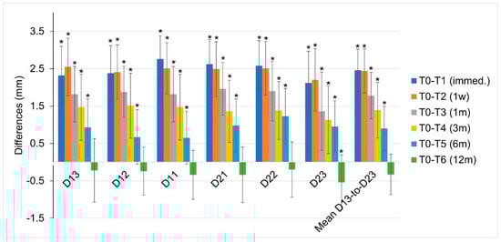 Differences (mm) between the measurement before and after treatment at T0–T1 (immed.) and with respect to the rest of the time points for each of the teeth evaluated and the mean of the six tooth measurements, Mean D13 to D23. Taking the value 0 mm as the measurement before treatment (T0), the asterisks indicate a statistically significant difference between the measurements before treatment and those taken at each time point (T1, T2, T3, T4, T5 and T6).