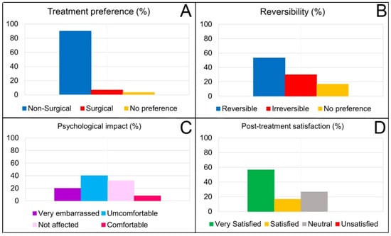 Results in percentages of the preference for surgical treatment or not (A) and reversible or not (B) for the correction of the gummy smile (n = 50). Percentages of the psychological impact or affectation of GS on treated patients (C); proportion of satisfaction among patients after treatment (D) (n = 41).