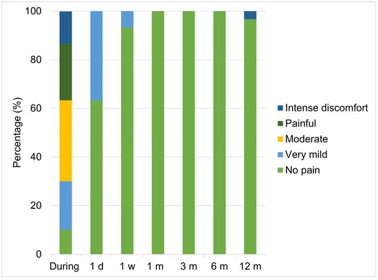 Results in percentages of the level of pain reported by the patients in the study throughout the entire process. Abbreviations: d, day; w, week; m, month.