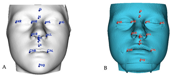 Figure 2. Automatic identification of 15 skin reference landmarks for automatic calculation of linear and angular measurements. (A) Scan performed with EM3D; (B) 3D model obtained from CBCT.