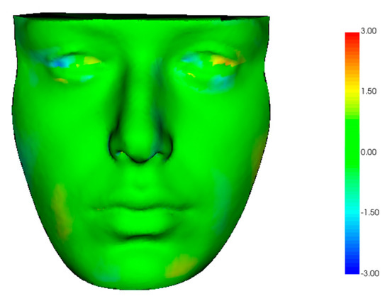 Figure 3. Qualitative analysis using colormap obtained by superimposition of EM3D scan on the model obtained from CBCT. Green indicates the absence of variations, red indicates outward displacement of facial scan, and blue indicates inward displacement. The colormap showed high accuracy in facial scanning with low discrepancy in the eye region.
