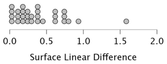 The overall surface difference reported high values of accuracy (mean discrepancy: 0.387 ± 0.361 mm). Considering the entire sample, 21 demonstrated a high degree of accuracy with a surface difference lower than 0.5 mm, eight were accurate (range: 0.5–1 mm), and only one exceeded 1 mm (Figure 4).