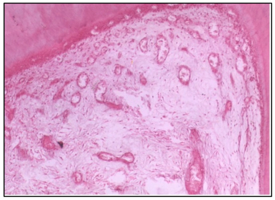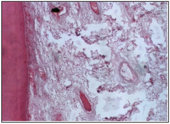 Regarding polyacid-modified composite resin, at 2 weeks, the specimens tested exhibited disorganization of odontoblasts and increased the vascular supply, indicated by the budding of new capillaries. This suggests an initial inflammatory response, possibly due to the material’s composition or the polymerization process. The increased vascularity can be interpreted as a reparative attempt by the pulp tissue to maintain homeostasis and facilitate healing [17].