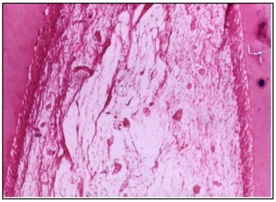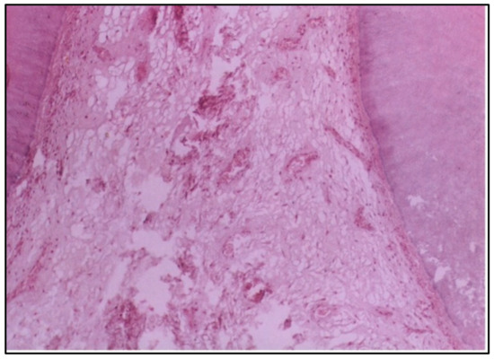At 6 weeks, the pulp tissue exhibited more pronounced destructive changes. The central region of the pulp and the area adjacent to the cavity showed degeneration, indicating that the pulp tissue was unable to recover and was undergoing significant damage (Figure 2).
