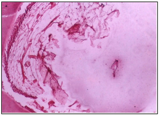 At 6 weeks, the damage was even more severe, with massive destruction of the pulp tissue, including the formation of a large abscess. This level of destruction indicates that the pulp could not withstand the long-term effects of the conventional composite resin, leading to extensive tissue necrosis and infection (Figure 5).