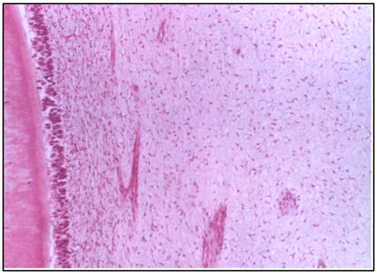 LS of the pulp in situ (control group) showing normal cellularity, normal vascularity, and proper alignment of the odontoblast cells (H & E Stain, ×100).