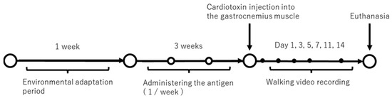 Fifty-six 8-week-old male Wistar rats (Sankyo Labo Service Corporation Inc., Tokyo, Japan) were randomly divided into two groups: P. gingivalis (PG) and saline (CO). The rats were housed in standard cages and maintained in a 12 h light-dark cycle room. After a 1-week adaptation period, rats in the PG group received intraperitoneal administration of sonicated P. gingivalis weekly, whereas those in the CO group received administration of saline. After 3 weeks of administration, gastrocnemius injury was induced in the left leg of the rats via cardiotoxin (CTX) injections. Motion analysis was performed before injection and on days 1, 3, 5, 7, 11, and 14 after the injury. After the last motion analysis, the animals were euthanised, and muscle evaluation was performed. The experimental protocol is shown in Figure 1. The occurrence of respiratory distress, symptoms of distress, difficulty in eating and drinking, significant weight loss, and chronic bleeding was set as humane endpoints, and the experiment was to be terminated if any of these symptoms appeared. Euthanasia was performed by carbon dioxide overdose, taking into consideration any pain the animals were suffering. The sample size was determined by the minimum number required to investigate the effect of P. gingivalis on muscle healing.