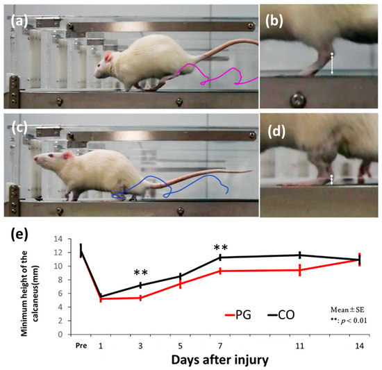 Motion analysis and minimum height of the calcaneus are shown in Figure 2. No significant difference was noted in the height of the calcaneus between the PG (12.278 ± 0.911 mm) and CO (12.279 ± 0.880 mm) groups pre-injury (p = 0.977). A reduction in the height of the calcaneus was observed in both groups of animals 1 day after injury, but no significant difference was noted (p = 0.375). The height of the calcaneus was significantly smaller in the PG (5.338 ± 0.333 mm) group than in the CO (7.194 ± 0.323 mm) group at 3 days (p < 0.01) and 7 days after injury (p = 0.01). At 14 days after injury, both the groups showed further recovery, and almost the same minimum height of the calcaneus as that before injury.