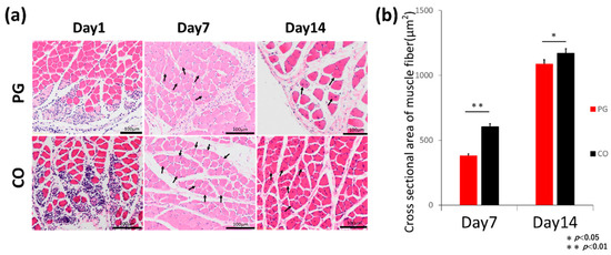 Histological images at 1, 7, and 14 days after injury are shown in Figure 3. At 1 day after the injury, necrotic myocytes and infiltrating inflammatory cells were observed in the PG and CO groups. In both the groups, inflammatory cell infiltration was less on day 7 than on day 1, and muscle fibres with a nucleus at the centre of the injured area were observed. This indicated that the muscle cells had started to regenerate. On the 14th day, almost no inflammatory cells were found in the injured area, with progressive muscle cell regeneration. The CSA of the injured muscle fibres recovered to the same extent as did the undamaged portion; however, gaps were observed between the muscle cells. The CSAs of the repaired muscle cells between both the groups were significantly different at 7 and 14 days after injury. The cross-sectional area of the repaired muscle cells in the PG group was smaller than that in the CO groups at 7 days (p < 0.01) and 14 days after the injury (p = 0.019).