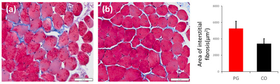 In the case of muscle injury, delayed healing has been shown to cause fibrous tissue to enter the muscle cells, resulting in fibrosis. This fibrosis causes delayed healing as well as injury recurrence [29]. Muscle injury is characterised by a high recurrence rate, and early healing is important to prevent recurrence. Additionally, the fibres were stained with Masson’s trichrome to measure the degree of fibrosis. The PG group tended to have a larger fibrotic area than the CO group; however, the difference was not significant. However, the study period may have been too short to compare the extent of fibrosis. Further studies could allow for a longer recovery period to assess fibrosis, which may be related to the risk of recurrent muscle injury.