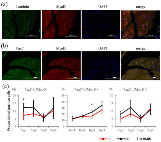 Figure 5 shows immunostaining results and ratios of each positive cell type. Images stained simultaneously with laminin and PAX7 confirmed that the satellite cells were located outside the sarcolemma and beneath the basement membrane of the muscle fibres. The percentage of PAX7+/MyoD− cells was significantly higher in the CO (12.325% ± 2.490%) group than in the PG (7.172% ± 2.660%) group 1 day after injury (p = 0.0379). In addition, the percentage of PAX7+/MyoD+ cells was higher in the CO group 5 days after injury (p = 0.0499).