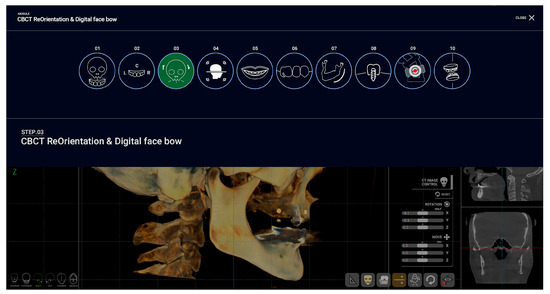 For treatment planning and surgical template design, R2Gate™ software, version 2.0.0 (MegaGen, Daegu, Republic of Korea) was used. The software includes 10 features with corresponding steps: (1) CBCT and STL matching; (2) fine-tuning model matching and fine-tuning facial scan matching; (3) CBCT reorientation and digital facebow; (4) hard tissue cephalometric analysis; (5) 3D smile design; (6) wax-up design; (7) mandibular nerve tracing; (8) implant surgery; (9) quick guide and digital mounting; (10) adjusting the vertical dimension (VD) and Face Guide view [