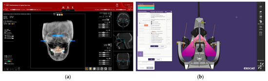 Figure 6a, the mounting plate of the articulator and the hinge axis are aligned with the maxillary model, and this configuration can be saved as an STL file for transfer to EXOCAD version 3.1 Rijeka (Exocad GmbH, Darmstadt, Germany) software. In EXOCAD, the hinge axis and mounting plate corresponding to those of the Artex articulator (Amann Girrbach AG, Mäder, Österreich) are used for the digital mounting of the models and for designing the prosthetic provisional (