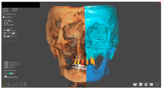 26]. The assessment of trueness in implant positioning was conducted by referencing anatomical landmarks from both the preoperative and one-year postoperative CBCT scans, which were performed using a strict protocol at the same radiologic center (FM Medident, Bucharest, Romania). The preoperative CBCT, along with the treatment plan saved as an STL file, was superimposed onto the postoperative CBCT in R2Gate software (