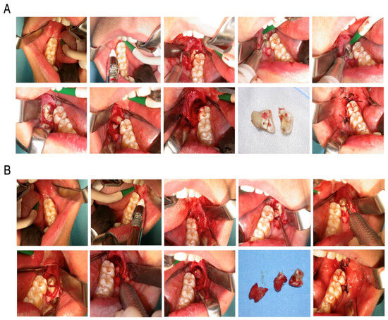The clinical picture of the surgical procedure of bone harvesting from a retromolar area at the baseline situation and incisions similar to wisdom tooth extraction. A representative step-by-step guide for (A) the piezoelectric technique and (B) the conventional technique. Both representative pictures begin with the upper images followed by the lower ones.