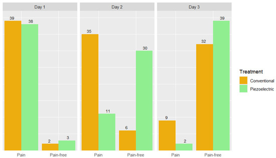 Firstly, the study population was stratified based on the type of surgery received to evaluate differences in postoperative pain. Notably, from day four onwards, all sites were pain-free. In Figure 2, the distribution of pain, considered as a dichotomous variable (pain/pain-free), between the two treatments was analyzed. Sites treated with the piezoelectric technique exhibited a median of one day of pain, compared to two days for sites that underwent conventional surgery. The Wilcoxon paired test confirmed a significant difference between the surgical methods (p < 0.001).