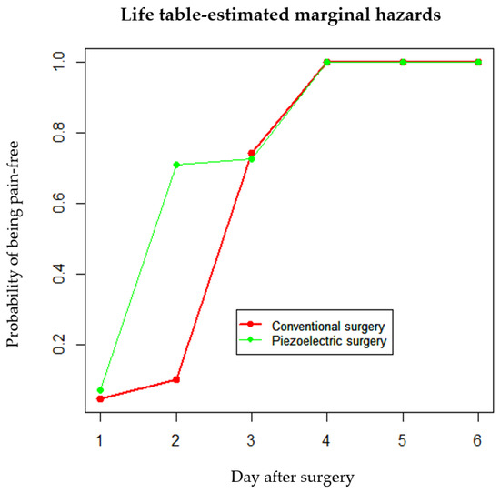 Lastly, when considering pain as a time-to-event outcome (days to being pain-free), the hazard function for pain relief was estimated each day using the life tables method, considering the last day of pain for each patient’s treated sites. It was observed that the probability of being pain-free (that is, the marginal hazard of not having pain) was higher in sites treated with experimental surgery on days one and two. However, the estimates were similar on day three, with the conventional treatment showing a higher probability. This discrepancy is due to the lower number of piezoelectric sites still experiencing pain (the number at risk). Consequently, the difference between these two lines was statistically significant (Chi-square p-value < 0.001) (Figure 4).