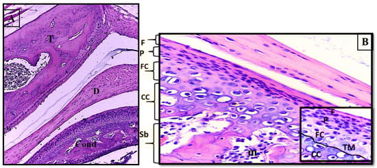 A histological picture of the TMJ of a normal rat showing (A) the mandibular condyle (Cond), biconcave articular disc (D), and temporal bone (T). (B) The condylar head has four zones: the fibrous zone (F), proliferative zone (P), fibrocartilaginous zone (FC), and calcified cartilage zone (CC) or hypertrophic zones and subchondral bone (Sb). The tidemark (TM) and bone marrow space (m) [10,18].